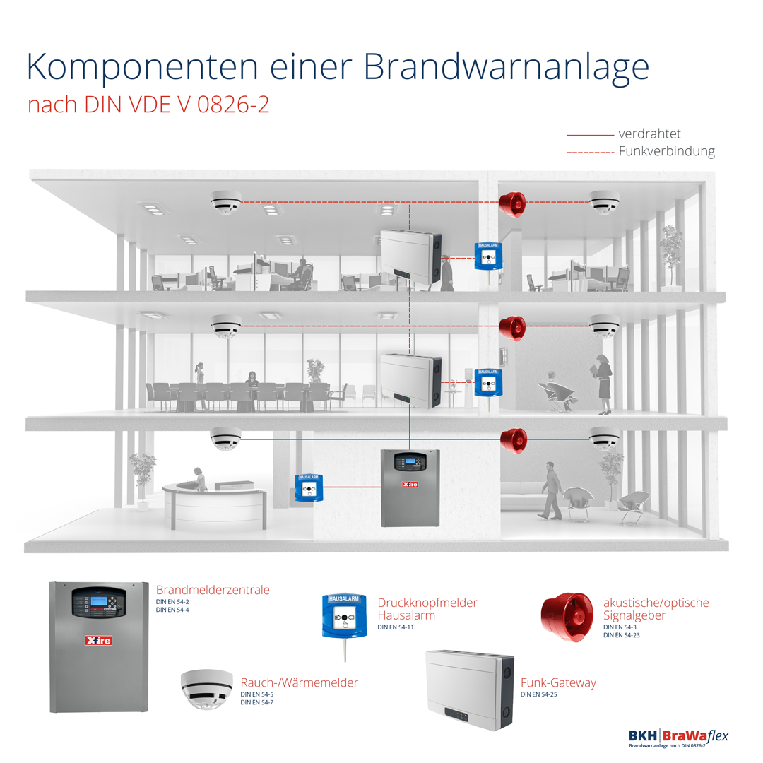 Nutzen Sie die Vorteile einer Hybrid-Brandwarnanlage und kombinieren Sie konventionell oder Loop-verdrahtete Komponenten mit Funk-Meldern für maximale Flexibilität und Zuverlässigkeit. Ob für Modernisierungen, Sanierungen, Neubauten, Bestandsobjekte oder geplante Anbauten – mit der BKH BraWaflex Brandwarnanlage als Hybrid-System sind Sie bestens aufgestellt – und das nach der vorgeschriebenen DIN VDE V 0826-2!